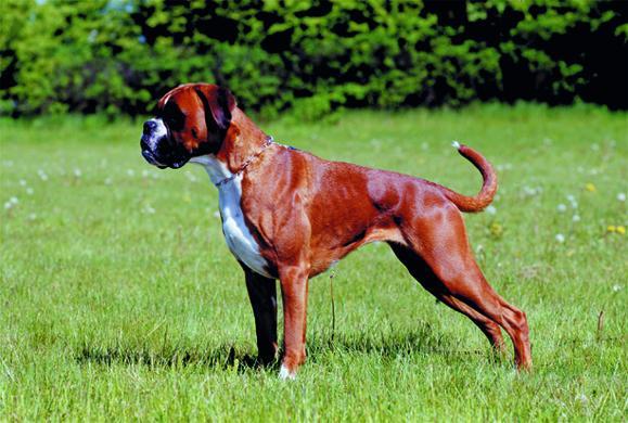 Entre las características físicas de El Bóxer se encuentran una cabeza pesada, mandíbulas pronunciadas, morro enmascarado, orejas más bien largas y colocadas hacia arriba, ojos de color castaño oscuro, cuello fuerte, redondo y musculoso. Pecho amplio y patas traseras musculosas. El bóxer tiene el pelo corto, brillante y suave, de color leonado o con rayas oscuras sobre fondo leonado. Algunas veces tiene manchas blancas o totalmente blanco.