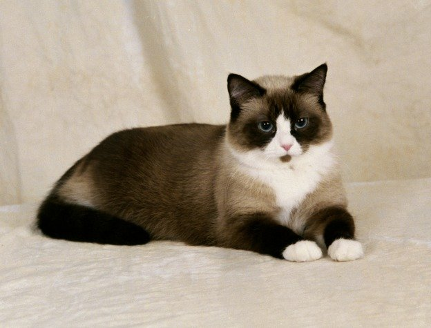 El Gato Snowshoe combina la corpulencia del americano de pelo corto y la elegancia del gato siamés. Su cabeza tiene forma de triángulo redondeado, sus ojos son grandes e inclinados, y sus orejas son bastante separadas, son largas y puntiagudas. Su cuerpo es largo y de aspecto atlético. El hocico, las orejas y la cola son más oscuras que el resto del cuerpo.