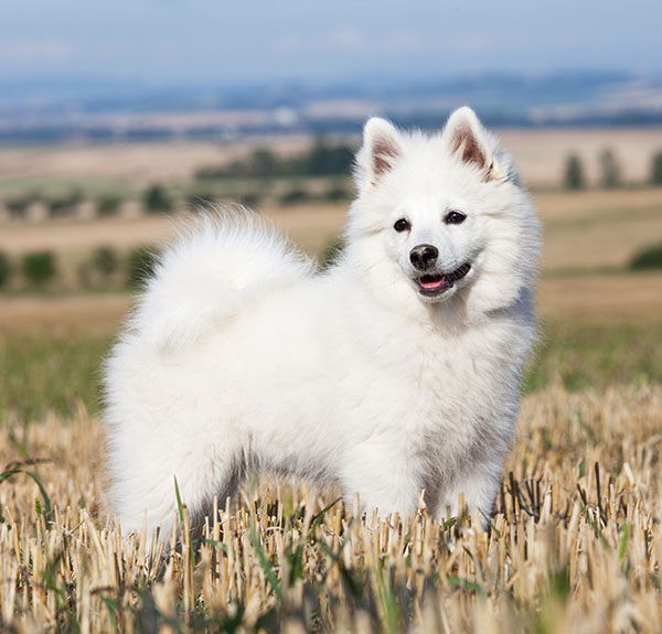 El Spitz alemán de pelo duro es un perro de tamaño pequeño/mediano, se caracteriza por su pelo largo, su típica cabeza compacta con orejas triangulares y puntiagudas y su cola curvada sobre el lomo con pelo largo.